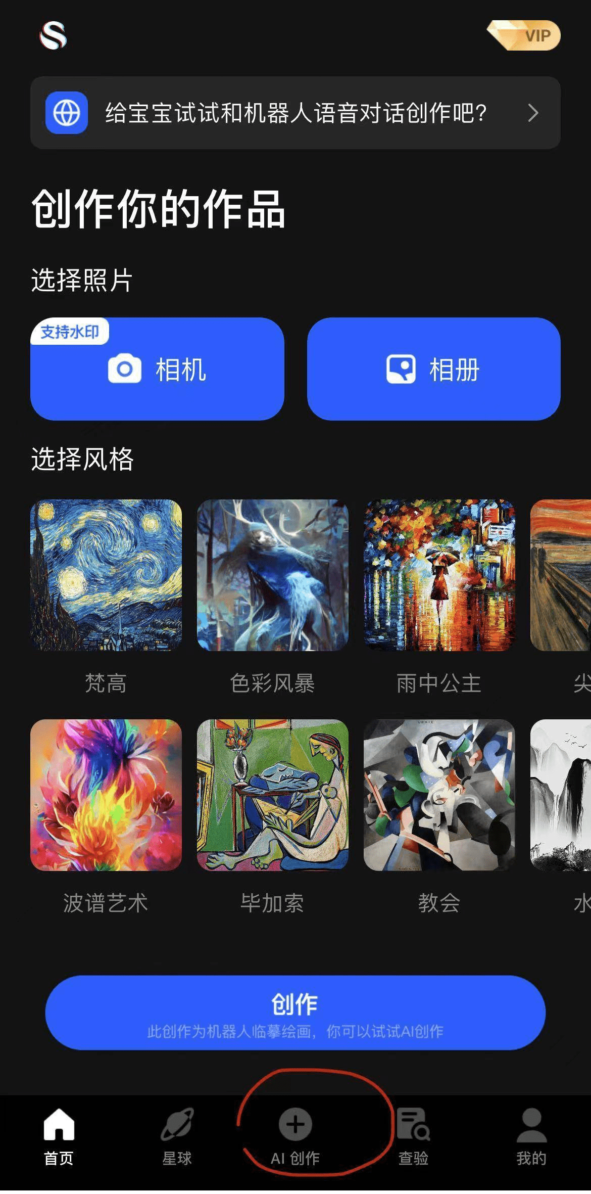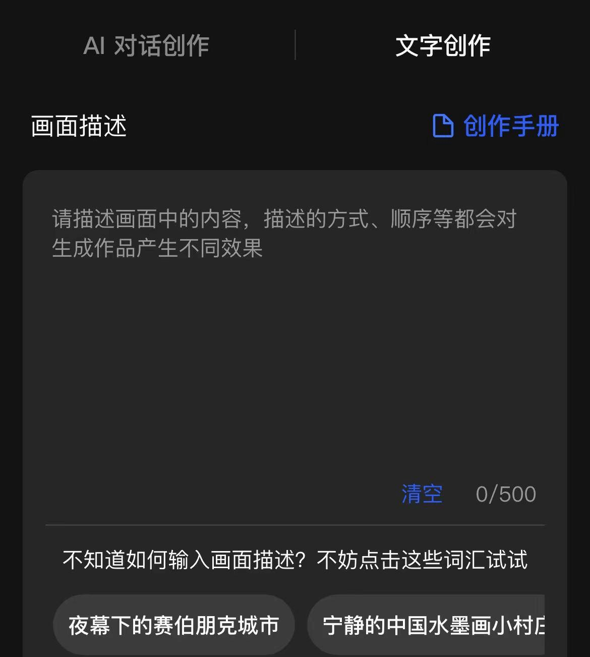 这里给大家做一个示范,我们打开这款国产ai绘画软件,点击AI创作,在关键词描述框里输入下列词: