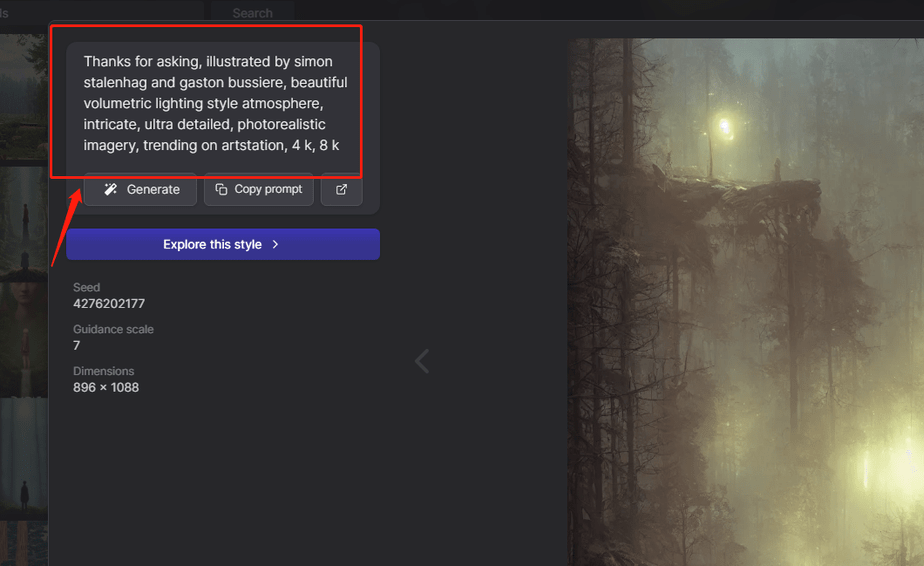 红色框里的这些就是这张照片生成时用的关键词,我们将它复制下来,然后粘贴在我们之前打开的软件的“画面描述”框里。