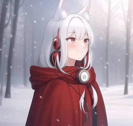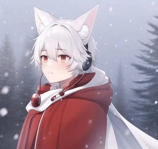 狐耳少年、雪、红色斗篷、白色围巾、红色耳机、精美cg