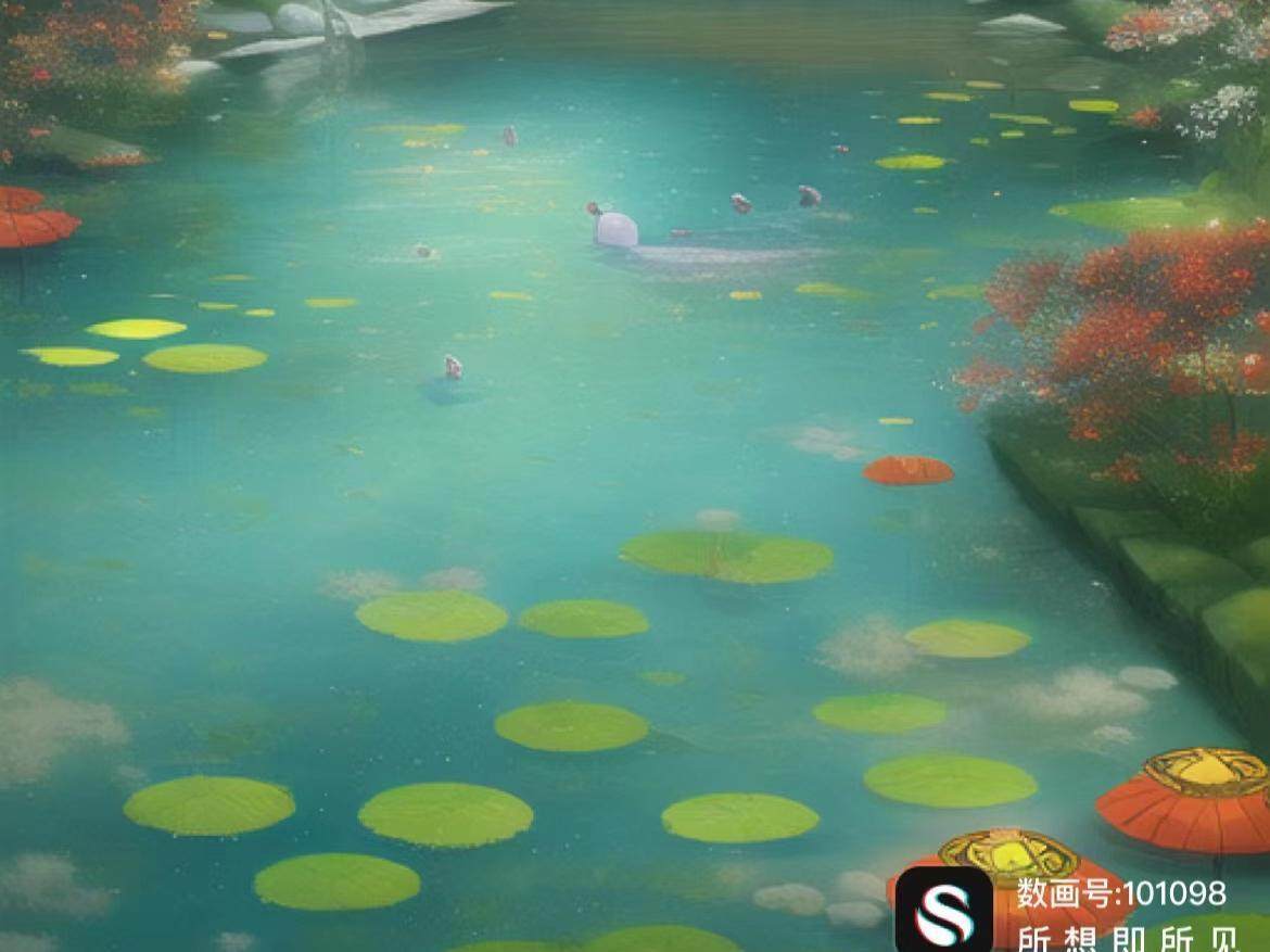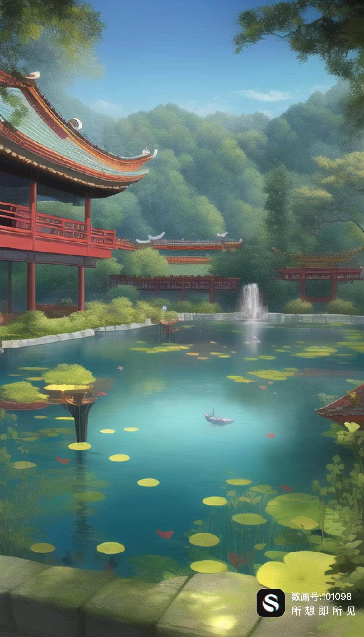最后合在一起,我们的写下的描述词就是:中式建筑,池塘,细节丰富,背景华丽,手绘,厚涂,治愈系,