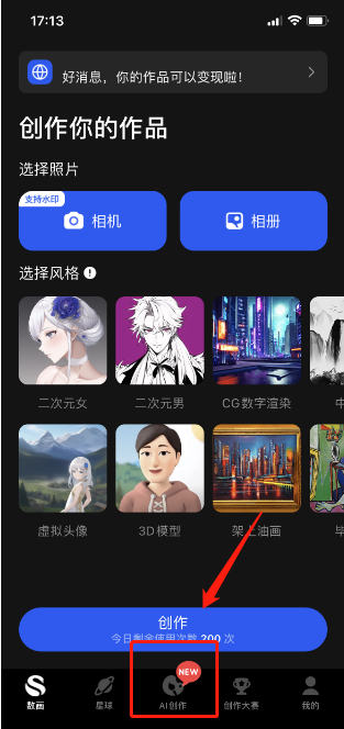 首先,我们先打开软件,选择底部中间的AI创作。