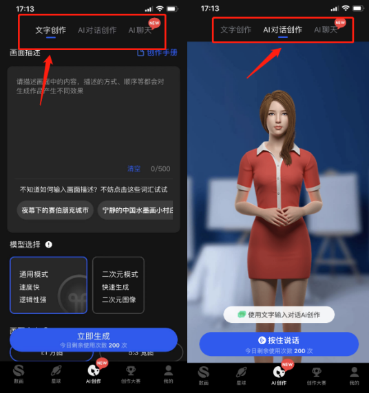 接着,AI创作界面会出现三个选项,分别是文字创作、AI对话创作、AI聊天。文字创作和AI对话创作只需输入你想要的关键词或简单的一句话,就能生成一幅画。