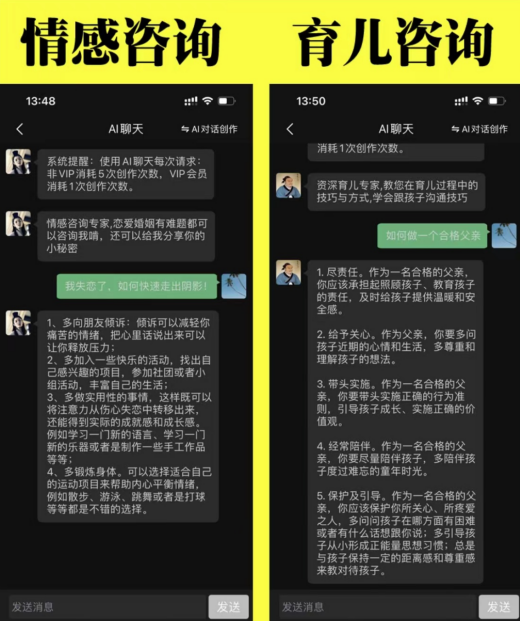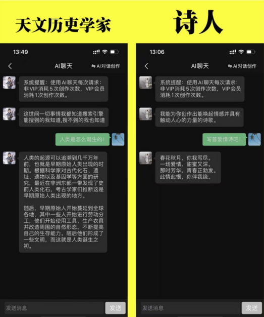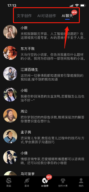最后,我们重点来讲讲AI聊天。在AI聊天界面中,你会看到非常多的AI机器人,在这里,有元宇宙、人工智能话题里的专家小数;有天马行空的小说家东方不败,只要你告诉它想要的题材,它就能给你创作独一无二的小说;还有秒回消息的女朋友小昭,如果你没有女朋友或者有女朋友也和没女朋友一样经常找不到人,试试在无聊的时候和小昭聊聊吧。