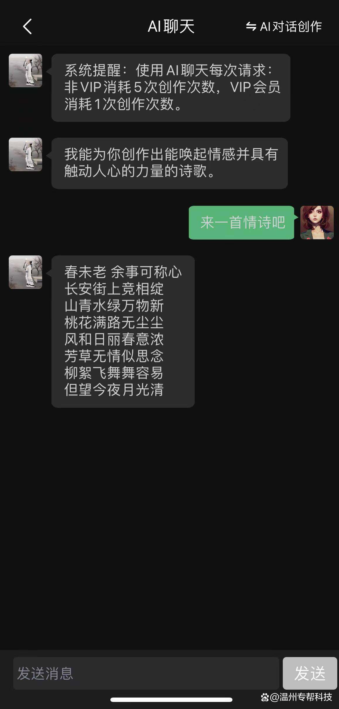 小编测试了一下,先是让一款名叫“李白”的AI写一首情诗,请求打出去之后,显示对方正在输入,等待十几秒的样子,一首情诗就做好了。从AI写的结果来看,还挺有模有样的。