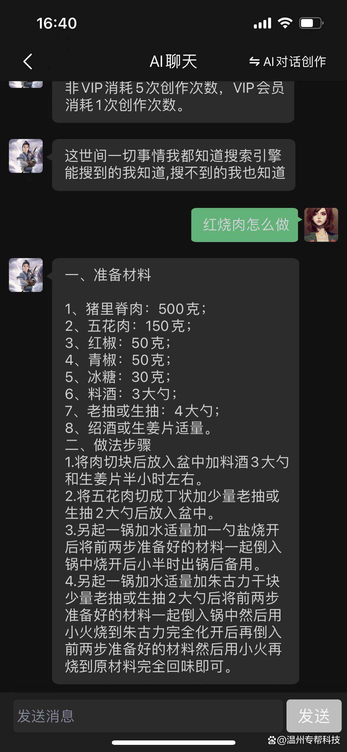 小编又找了另一个号称知晓一切事的机器人,打出请求-红烧肉怎么做,等待十几秒后,具体的做法就出来了,内容逻辑条理清楚,可以算得上是满意的回答。