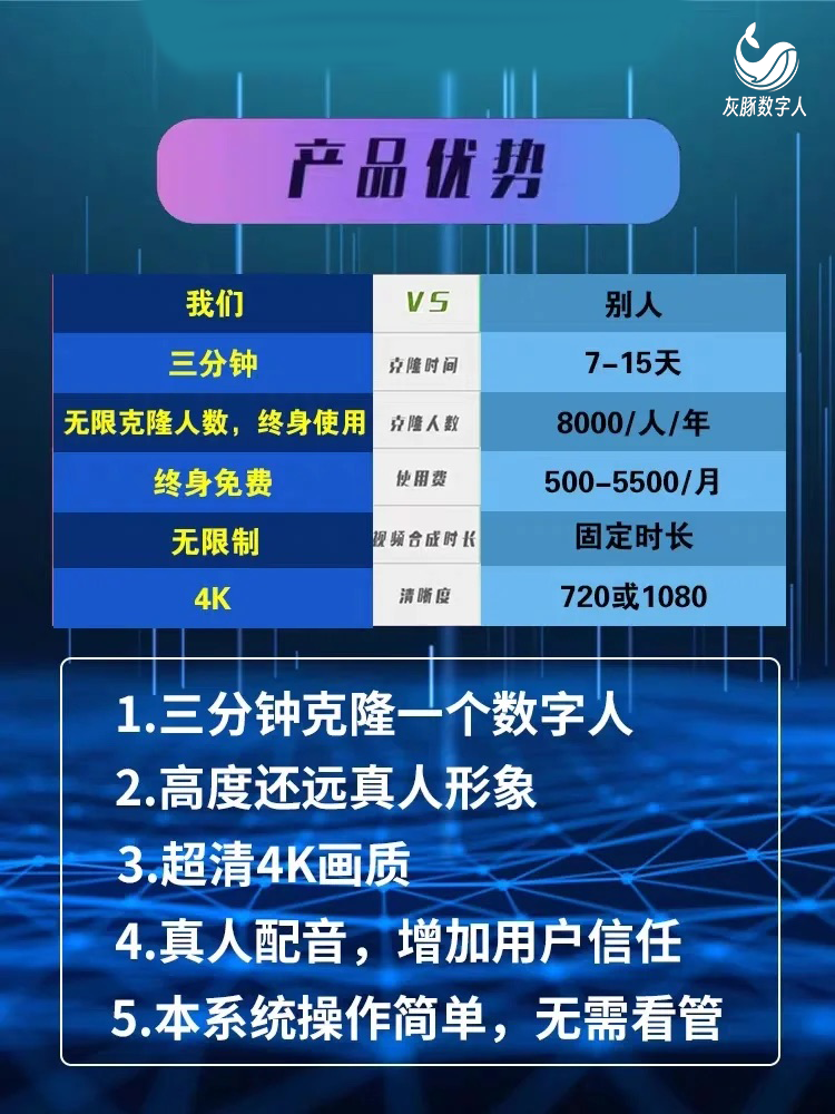 其次选择功能强大的,更要看这家公司源码系统的优势所在,就拿上面这家来说,它克隆一个数字人只需要3分钟,而且可以无限克隆数字人,无限生成视频,而且还是高清4K,最重要的是拥有直播系统源码后可以终身免费使用系统源码部署。大大减少企业后续费用支持,真正做到了一次买断,终身收益的优势。