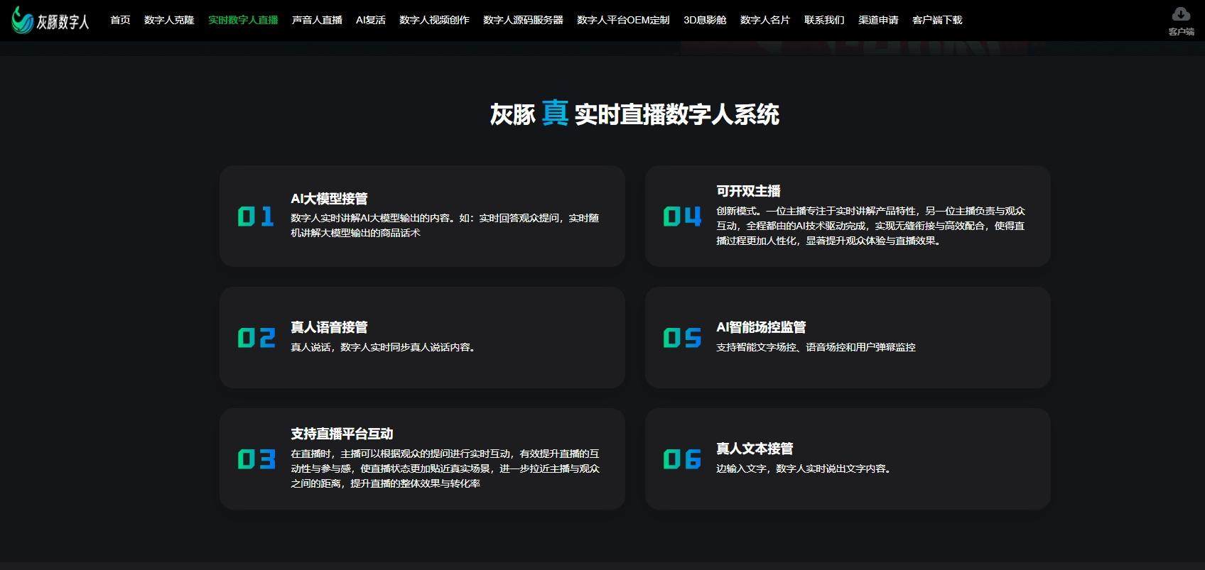 拿上面提到的灰豚来说,作为数字人源码厂商中的头部,它光是在数字人主播生成方面就拥有着三维重建、TTSA+音视频驱动技术、ARKit表情识别和AIGC等数字人形象制作技术和照片克隆、AI数字人克隆系统、AI声音人克隆系统和灰豚MotionAI大模型等数字人克隆技术以及“1+N”数字人训练模式等。