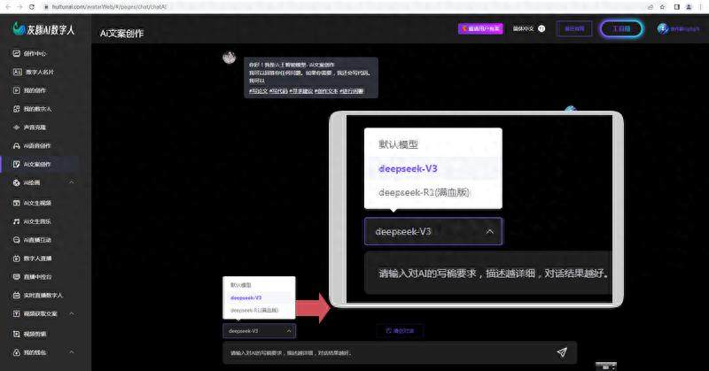 作为AI数字人领域的爱好者,小编也是紧跟时事地打开了灰豚数字人的官网,发现它的模型选择框中接入了满血版DeepSeek-R1与Deepseek-V3高速版。在此前提下,再结合它们系统中原有的灰豚MotionAI大模型和灰豚AI生态链,我们就可以在用它克隆出在外观上媲美真人的数字人形象和打开各种应用场景的同时,借助DeepSeek本身多场景实用性和高效的自然语言处理能力等特征获得更加具备专业性和人性化的高质量文案和互动话术,来供数字人主播播报和让我们自己得到更加精确的视频内容。