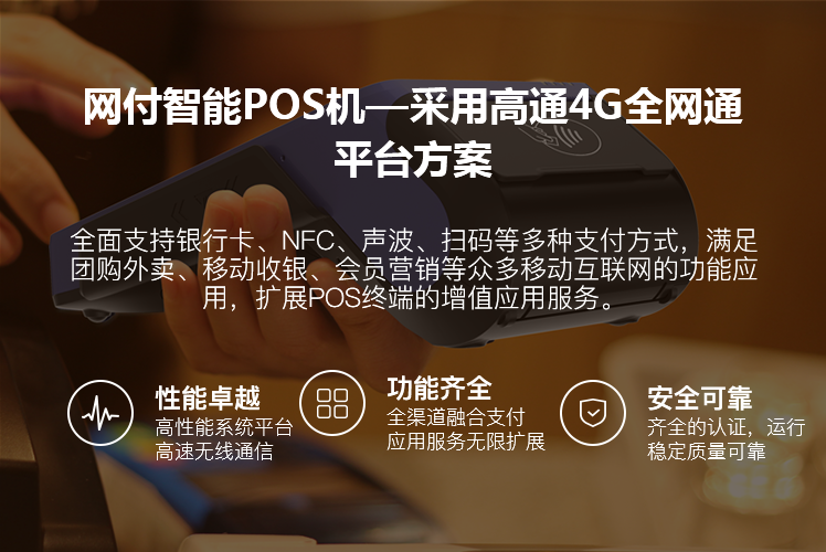 智能POS终端产品采用高通4G全网通平台方案,产品性 能强劲,不仅同时支持3大运营商的所有4G、3G、2G通 讯制式,而且支持流畅运行Android5.X操作系统版本,具 备良好的系统体验与通讯兼容性